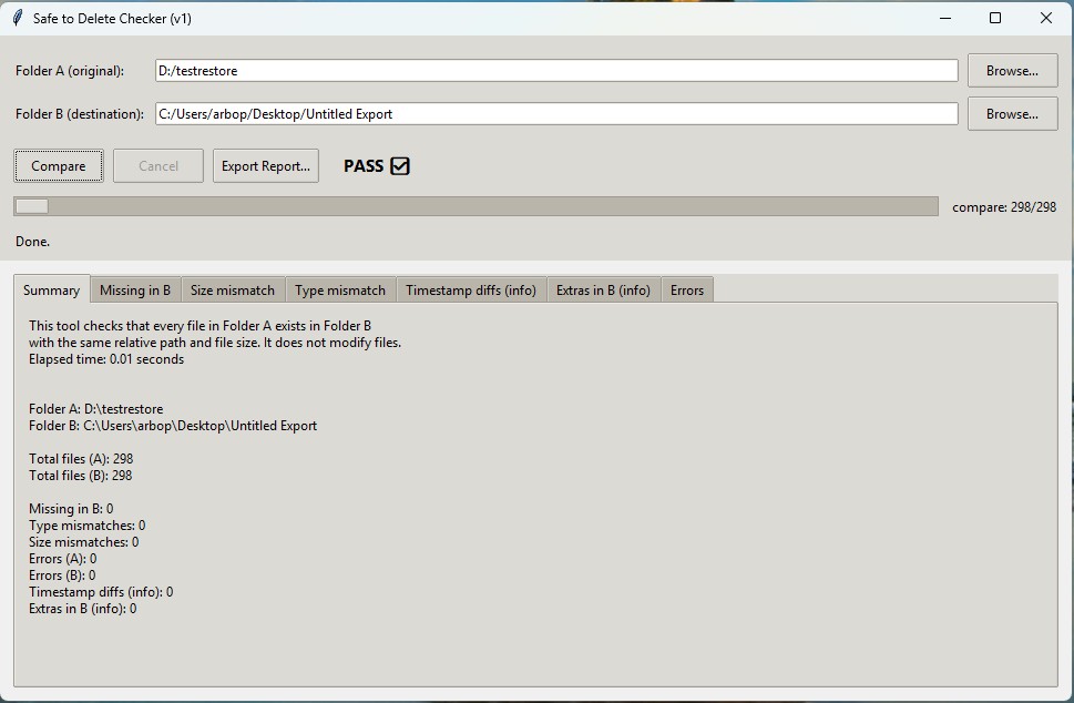 A utility to verify two folders match before you delete anything. Built for real-world backup sanity.